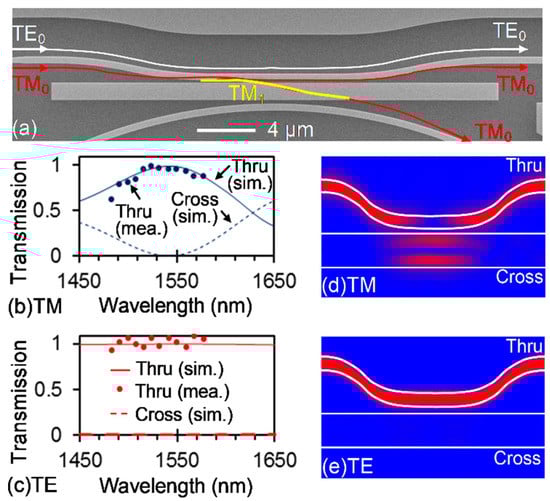 The fabricated multimode waveguide-based PBS is shown in Figure 3a. Here, the width of the multimode waveguide is designed to be 1300 nm to fulfill the phase-matching condition for the TM0 mode in the 500-nm-wide single-mode waveguide and the TM1 mode in the multimode waveguide. The gap between the single-mode bus waveguide and the multimode waveguide is 200 nm. Figure 3b,c shows the simulated and measured spectra for the PBS when it operates on the TM and TE modes, respectively. Here, the coupling length is chosen as 10.74 μm to allow for a complete coupling period, and we do not take the MRR into consideration. The measured results agree well with the simulation, showing that TM-polarized light can be completely coupled back and forth from/into the multimode waveguide, and that TE-polarized light is hardly coupled into the multimode waveguide. Figure 3d,e further presents the splitting function of the PBS with the aid of full-wave simulation for the TM and TE modes at 1550 nm, respectively.