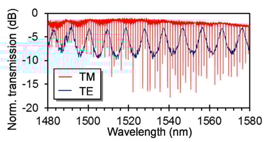 For the proposed silicon photonic PM sensor, we have also designed the length of the FP resonator L, radius of the MRR R and the distance of the MRR to the multimode waveguide to be 25 μm, 100 μm and 700 nm, respectively. The measured spectra of the fabricated sensor are shown in Figure 4, which are normalized to a straight waveguide. They clearly show the expected functions, that is, FP resonating for the TE mode with a large FSR of 9.352 nm and MRR resonating for the TM mode. The losses of the sensor for the TE and TM modes around 1550 nm are 2.6 dB and 1.7 dB, respectively. The loaded and intrinsic Qs of the MRR for the TM mode are found to be ~40,000 and ~92,000, respectively, corresponding to a bend waveguide loss of ~5.7 dB/cm.