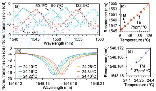 The fabricated silicon photonic PM sensor with silica cladding was measured at different temperatures. The temperature was set and stabilized by a feedback system comprising a semiconductor temperature (LM335) and a semiconductor thermoelectric cooler (TEC) beneath the under-test sample. Figure 5a,b shows the spectra for the TE mode when the temperature coarsely changed from 11.5 °C to 122.3 °C and for the TM mode when the temperature delicately changed from 21.10 °C to 24.40 °C with a step of 0.06 °C, respectively. Here, for the spectra of the TE mode in Figure 5a, the measured results are presented by open markers, and the solid lines are the fitting curves to extract the constructively resonating wavelengths. The fitting curves follow the function of T = 1/(1 + Fsin2(δ/2)), where T is the transmission of the FP resonator, F is only determined by the reflectance of the subwavelength grating and δ is determined by the wavelength and the resonator length. One can find that the construction wavelength still varies in one FSR despite a large temperature range of ~111 °C. From Figure 5b, one can see the spectra at different temperatures are clearly distinguishable with each other, showing efficient detection of the very small temperature variations and suggesting a high resolution. Furthermore, curves (not shown) following the Lorentzian function were also used to fit the spectra to extract the MRR resonant wavelengths. Figure 5c,d shows the resonating wavelengths for the TE and TM modes at different temperatures, respectively. It is worth noting that the coefficient of determination (R2) of the aforementioned fittings is >90% for all fittings, suggesting reliable extracted wavelengths. Linear fittings in Figure 5c,d give a temperature sensitivity of 79 pm/°C and 37 pm/°C with a good agreement with the simulations, that is, 76 pm/°C and 43 pm/°C for the TE and TM modes, respectively. Considering a minimal wavelength shift equivalent to 1/15 of the resonator linewidth (39 pm) can be easily detected [], the minimal detectable temperature change (i.e., resolution) is 0.07 °C, agreeing well with our measurements. The resolution can be potentially further improved to, for example, 0.04 °C by enlarging the distance from the MRR to the multimode waveguide and, thus, the loaded Q since the intrinsic Q of the MRR is ~92,000, corresponding to a minimal linewidth of 17 pm.