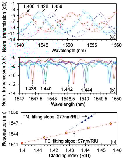 We have further exploited the fabricated silicon photonic PM sensor (with the same structural parameters as the above one but without the top silica cladding) for detecting the analyte refractive index (RI). Here, we used a series of index-matching fluids with RIs from 1.400 to 1.458 with a step of 0.002 to verify the performances of the sensor. The fluids were dropped on the sensor for measurements and then rinsed off with acetone/isopropanol/de-ionized water and dried by a nitrogen gun for the next round of measurements. Figure 6a,b shows the measured spectra of the fabricated sensor cladded with the fluids with different RIs for the TE and TM modes, respectively. For the TE mode, the measurement results are shown with open markers, and fitting curves are shown with the dashed lines, while for the TM mode, only the measurement results are shown. Figure 6c shows the measured resonant wavelength shifting with the cladding RI for both TE and TM modes as well as the linear fittings (dashed lines), which give sensitivities of 277 nm/RIU and 97 nm/RIU for the TE and TM modes, respectively. Here, RIU represents the refractive index unit. Although the measured RI step here is 0.002, the highest capable resolution is 2 × 10−5 RIU for the present sensor, considering a MRR linewidth of 86 pm and a sensitivity of 277 nm/RIU for the TM mode. Moreover, the attainable RI range is 0.096 RIU, considering a FP FSR of 9.352 nm and a sensitivity of 97 nm/RIU for the TE mode, larger than the measured 0.058 RIU here.