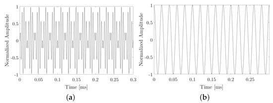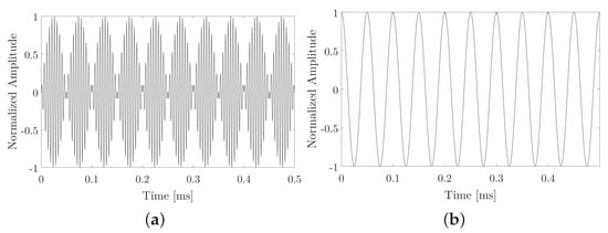 These signals can be obtained parametrically using a modulated signal whose modulation FSK corresponds, alternatively, to two signals of modulating frequencies and , that must be half of the frequencies associated with each one of the bits that we want to receive, which is, properly, another parametric type signal []. Thus, through this non-linear technique, by modulating a carrier with an FSK, another FSK of twice the frequency is obtained. Depending on the bit to send, its mathematical representation is given as follows: