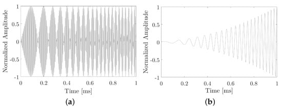In a search for new modulation techniques that allow both temporarily locating each of bits 1 and 0, as well as discriminating between them, sine-sweep modulation is applied by applying parametric sweeps Figure 8. Given their robustness, these signals are being used recently as non-linear acoustic communication techniques [,]. Therefore, these signals will be analyzed by applying the 16-bit string to determine if the correlation detection is still appropriate for this type of signals.