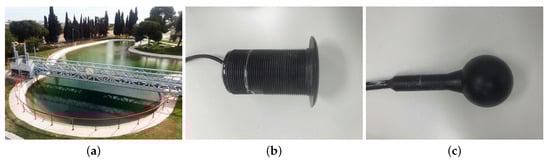 Location where the experimental measurements were made. (a) Lake; (b) Airmar P19 emitter; (c) ITC 1032 receiver.
