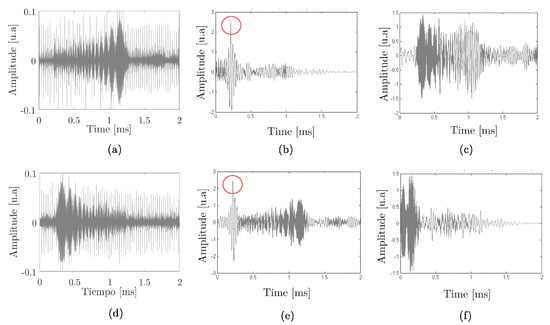 In Figure 5a,d, presented the upward and downward sine-sweep respectively of the received signal. Figure 5b, when correlating the received upward sweep (bit 1) with the envelope (expected parametric signal) of bit 1, a correlation peak in the expected time of 0.2 ms is observed for the expected distance between transducers (30 cm); we will call this “true bit”, while Figure 5c in case of the correlation with the envelope of bit 0, shows that there is no correlation maximum; we will call false bit. Regarding Figure 5e, the correlation of the received descending sweep (bit 0) with the envelope of bit 0 shows an expected correlation maximum of 0.2 ms, unlike Figure 5f; (true bit) which, when correlated with bit 1, no correlation peak is required (false bit). With this, the goodness of cross-correlation as a technique for detecting digital signals, starting from sweeps parametric signals, becomes evident.