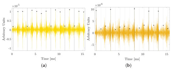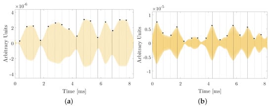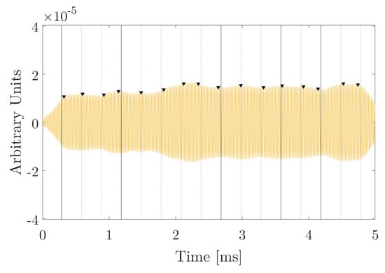 In Figure 7, we have an example for one of the PSK signals measured in the pool, with a of 200 kHz and an expected frequency of 50 kHz at 300 μs. As observed, there is no differentiation between the received bits (1 and 0) at the time of their detection, since there is an amplitude value for bit 1 and 0 of and respectively, while the amplitudes of the false bits correspond to and respectively.