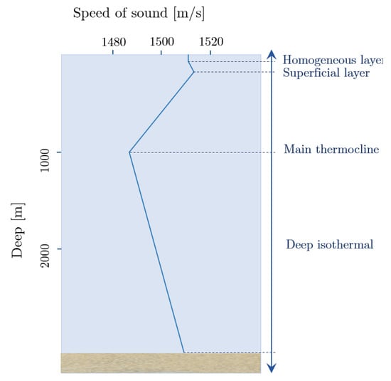 The generation of the multiple trajectories that a signal undergoes in the sea is conditioned by two effects: the reflection of the signal between the surface and the bottom and/or any object, and the refraction of sound in the water. The latter is a consequence of the variability of the speed of sound in water. The speed of sound depends on temperature, salinity and pressure, these, in turn, vary with depth and location. Signal rays tend to lean towards the region with the slowest propagation speed. Near the surface, velocity tends to be constant since temperature and pressure are also constant. In areas with warm temperatures, the temperature decreases as the depth begin to increase, however, the increase in pressure is not enough to compensate for the effect on the speed of sound. Thus, the speed of sound decreases in the region called the main thermocline. After a certain depth, the temperature reaches a constant level of ∼4, and thereafter the speed of sound increases with depth (pressure). From this when a source emits a signal, this will follow a slightly different path due to the effects described above, and the receiver will receive not only the direct signal but each one the reflections. To more information details can be found in [,]. An example of the typical sound velocity profile in the marine environment is presented in Figure 9.