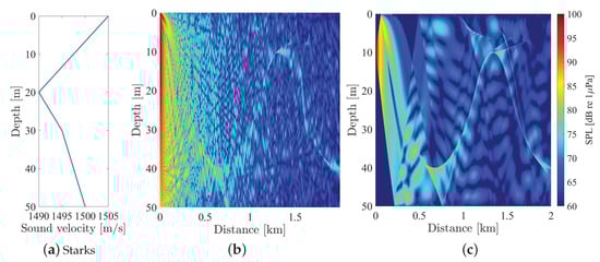 In Figure 10a, it is shown the variable propagation sound speed profile; in Figure 10b, the acoustic field with an omnidirectional source (directivity of ); on the Figure 10c, the acoustic field with an directional source of . These directivities correspond, referring to previous studies by the authors on the behaviour of the parametric sound field [], those generated by an Airmar P19 transducer emitting a parametric sweep between 4 and 40 kHz by modulating a 200 kHz carrier.