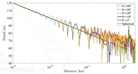 Another way to analyze how directivity allows obtaining a field with less effect from multiple reflections is drawing the acoustic field along one direction, for example, in a horizontal direction at the same depth as the emitter, where the receiver of the underwater acoustic communication is placed. The Figure 11, shows this acoustic field for different source directivities. A line has been added that corresponds to a spherical spread without any reflection.