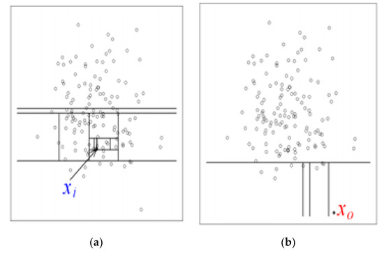Examples of normal vs. abnormal data: (a) indicates how X_i needs more splits and trees to reach the data. (b) indicates how X_o, an anomaly, needs much less trees.