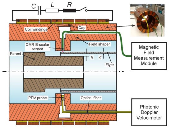 The dynamics of the magnetic field at the gap between the field shaper and the flyer during electromagnetic compression and MPW were measured using a high-pulsed magnetic field measurement system based on CMR-B-scalar sensors, which were developed at the Center for Physical Sciences and Technology, Vilnius, Lithuania. The system consisted of a CMR-B-scalar probe and an electronic measurement module. The probe was designed as a flexible, 3 mm in diameter and 1 m long screened cable with a 1 × 0.5 × 0.25 mm3 volume CMR-B-scalar sensor at its tip. The sensor was made from manganite film, which exhibits a negative colossal magnetoresistance effect. Due to Mn excess, it has an increased temperature range of operation from 0 °C to 90 °C (see Žurauskienė et al. []). The active material in the sensor was a 0.4 μm thick nanostructured La0.82Sr0.18Mn1.15O3 film grown on a polycrystalline Al2O3 substrate by pulsed injection metal-organic chemical vapor deposition (PI MOCVD), see Zurauskienė et al. []. The active part of the sensor’s material was 400 μm in width and 50 μm in length. Thus, the effective measurement volume was ~10−2 mm3.