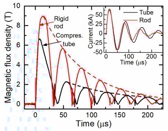 These differences are due to the tube deformation during the first half-wave of the current, which causes a significant increase of the inductance of the system consisting of the tube and the field shaper. This is also confirmed by the decrease of the frequency of the magnetic field oscillations (see Figure 2). According to Kleiner et al. [], during the compression process, when the flyer deformation starts, the total inductance of the consumer load (coil-tube) in the discharge circuit increases, which leads to a decrease of the oscillating current frequency and the amplitude. However, due to the presence of the field shaper, which is used in addition to the tool coil, the deformation of the tube only marginally affects the total inductance of the system (see Henselek et al. []). Consequently, the current in the coil changes only slightly (see inset in Figure 2). Nevertheless, this leads to a significant decrease of the magnetic field amplitude in the gap between the field shaper and the compressed tube. Moreover, as can be seen in Figure 2, during the compression of the tube, the temporal course of the first half-wave of the magnetic field is different from that of the rigid rod. Here, the maximum of the magnetic field is achieved much earlier than the maximum of the coil current. This means that despite the increase in coil current, the magnetic field in the gap decreases due to the deformation of the flyer.
