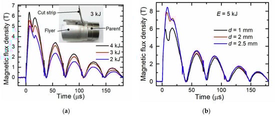 To study the influence of the charging energy E on the magnetic field oscillation waveforms during MPW of an aluminum flyer with a steel parent, experiments were performed at different charging energies (see Figure 3a) and with flyers having different wall thicknesses (see Figure 3b). The results of these investigations with a flyer wall thickness of 1.5 mm at charging energies of 2, 3, and 4 kJ are shown in Figure 3a. The first half-wave in all these welding experiments had two peaks. The first peak was similar to that observed during the free tube compression (see Figure 2). The amplitude of these peaks depended on the capacitor charging energy, namely, the lower the charging energy, the lower was the amplitude of the magnetic field peak, and the maximum of these peaks was reached later. As mentioned before, the magnetic inductance at the measuring point is the interference of the field generated by the field shaper and the induced current in the flyer. The second component, among other factors, depends on the distance between the field shaper and the flyer. The greater this distance, the smaller becomes the contribution of the magnetic field of the flyer. At a certain velocity of the flyer, the increase in time of the magnetic field in the field shaper (with the coil current still increasing) was compensated by a decrease of the magnetic field induced in the flyer. The first peak was obtained in this way. After the first peak was reached, the magnetic flux density dropped to some local minimum value, then increased up to the second peak and finally dropped to zero. Moreover, the minimum between these two peaks in time was achieved later and the relative value of the second peak was lower when a lower charging energy was used. After the end of the first half-wave, the following pulses continued to oscillate according to the damping law.