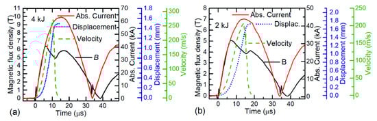 The displacement of the flyer as well as its velocity at 4 kJ and 2 kJ charging energies are presented in Figure 4a,b, correspondingly. A comparison of the flyer displacement over time and the magnetic flux density B waveform shows that the local minimum of B is reached at the collision of the flyer with the parent. At the instant of impact, the velocity of the flyer achieves its maximum value and then drops sharply. For E = 4 kJ (Figure 4a), the initial collision time is 11 µs after the start of the current pulse and the maximum impact velocity of the flyer is vi = 272 m/s. The total displacement of the flyer is 1.5 mm (i.e., the initial gap) and the deformation process is finished after 14 µs. The minimum magnetic flux density is achieved when the flyer velocity decreases to vi = 120 m/s. As it was noted above, the appearance of the first peak and the subsequent decrease of the magnetic field was the result of the flyer deformation caused by the magnetic pressure. In this case, an increase of the system’s inductance caused by the progressing deformation of the flyer slowed down the magnetic field so strongly that an increase of the current in the coil was not able to compensate for this decrease. However, when the velocity was decreased, the influence of the coil current on the magnetic field dominated and an overall increase of B was observed. For this reason, at the time instant of magnetic field minimum, the current did not yet reach its maximum value and continued to grow, which caused the appearance of the second peak in the field dynamics.