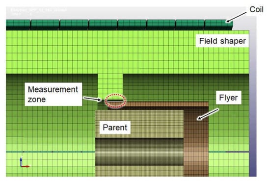 An alternative to these measurement methods could be an analytical investigation of the magnetic field dynamics in the gap between the coil or field shaper and the flyer during the MPW process. There have been several analytical calculations, which were performed for this purpose, as summarized by Psyk et al. []. For example, Nassiri et al. [] showed that, by using an analytical model for a single turn coil, one can predict the magnetic pressure on the flyer as well as its velocity during forming. In this case, the Lorentz force , which acts on the flyer, can be calculated as the vector product of the magnetic flux density of the coil (field shaper) and the eddy current induced in the flyer with a current density
