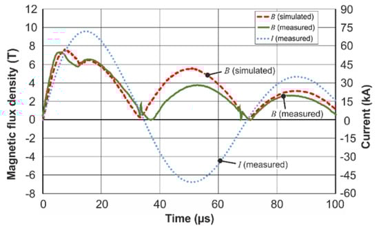 The comparison of the simulation results and the measurements of the magnetic field dynamics showed good qualitative coincidence between the simulation and the experiment (see Figure 6). Especially the temporal course during the first half-wave of the current pulse showed a promising accordance.
