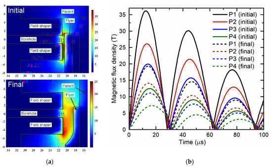 COMSOL simulation results of the magnetic field distribution at four positions in the gap between flyer and field shaper for the initial and final flyer deformation states ((a) strength of the magnetic field, (b) magnetic field oscillation). P1 is unaffected by the borehole, P2 is at the same radial position in front of the borehole, P3 and P4 is 0.5 and 1 mm inside the borehole, which is approximately the position of the probe in the experiments.