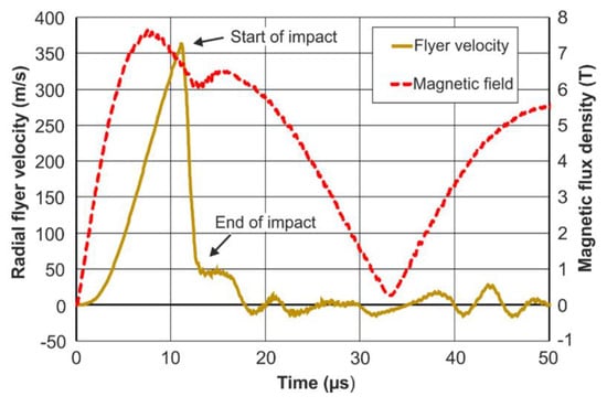 The numerical simulations allow for a detailed analysis of the interactions between the flyer deformation, the impact between the flyer and the parent, and the magnetic field dynamics. In Figure 8, the radial velocity of the flyer edge is plotted over time. It can be seen that the deformation of the flyer starts after with some delay and only after a certain level of magnetic field has been established. The induced stresses caused by the so-called magnetic pressure then exceed the initial flow stresses of the flyer material. The flyer is then rapidly accelerated until the standoff between the flyer and the parent is overcome. The contact of the inner flyer surface with the parent surface takes place at the maximum flyer velocity. It needs to be noted that, in the numerical simulations, the flyer velocity is determined for the flyer edge, which is obviously higher than at the PDV-measurement position a few millimeters along the flyer axis. This velocity peak is followed by a sudden deceleration, during which the flyer and the parent are slightly compressed, and a high contact pressure is formed. The deceleration phase takes only a few microseconds and its end can be identified by the local minimum of the magnetic field curve. This confirms the experimental results (Figure 4) and shows once again the potential of the magnetic field measurements for an in-depth analysis of MPW processes. The welding between the flyer and the parent was not modeled in the present LS-DYNA simulations and the flyer undergoes some vibrations after impact. This can be the reason for some of the deviations between simulations and experiment in the second and third half-wave of the current pulse shown in Figure 6. However, it is generally accepted that, among other parameters, the flyer’s radial impact velocity and the phase of impact between the joining partners have a paramount effect on the weld formation. Therefore, the correlation between the flyer deformation curve and the magnetic field measurements and the different characteristics for successful and unsuccessful welding trials are promising indications for the further development of this CMR-measurement method.
