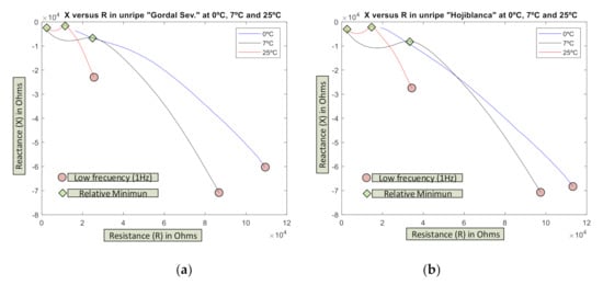 Previous tests have demonstrated that these impedance profiles do not adjust well to models of the type described [70] (see Figure 3b of said citation) with minimum at X close to zero. Conversely, in unripe olives at a low frequency, there are high values in both R and X (red circles on the graphs). Likewise, two relative minimums can be observed in the reactance X value (green diamonds) at 7 °C and 25 °C. The trend on the graph of 0 °C suggests that at frequencies over 100 kHz it would also exist in this case.