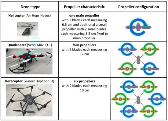 Figure 1 illustrates the drones used along with their propeller characteristics and configurations.