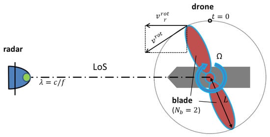 For a single propeller, shown in Figure 2, with a rotation axis perpendicular to the LoS, the micro-Doppler shift is determined by the radar wavelength and the relative or radial blade tip speed as