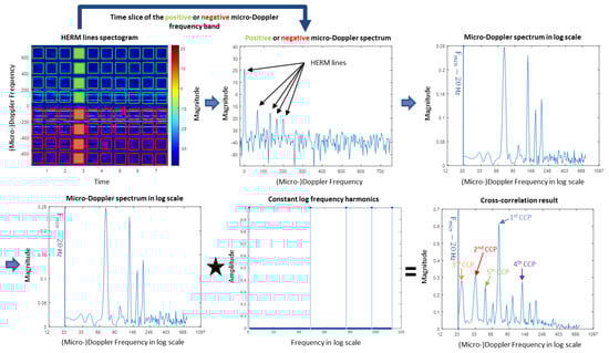 - Apply a cross-correlation to the micro-Doppler spectrum in log scale and the constant log frequency harmonics at every frequency. For the cross-correlation results of the C-band radar, three harmonics and, of the W-band radar, five harmonics at every frequency are used. The strongest Cross-Correlation Peak (1st CCP) determines the fundamental frequency.