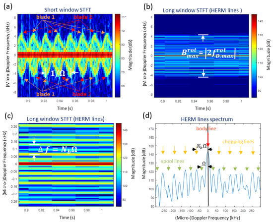 In Figure 4d, the HERM lines spectrum from Figure 4c centered at 1 s is shown. The positions of the body line, the spool lines, and the chopping lines are indicated by small arrows. The chopping and spool lines appear due to the net effect of all the contributions of the rotor blades reflecting the signal back in the direction of the radar [].