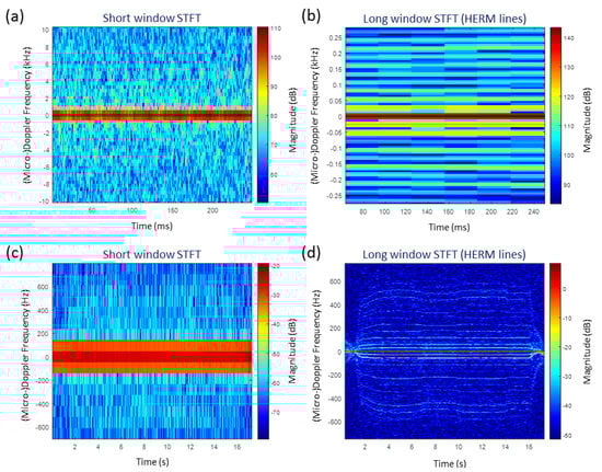 A long window STFT can be used as an alternative way to visualize micro-Doppler. By applying a longer window, several cycles of the rotor blades are included in the coherent processing interval (CPI), and the spectrogram is dominated by the rotation frequency of the blades causing modulation peaks and the instantaneous relative velocity of the blades is no longer observable []. The long window STFT results in a so-called HElicopter Rotor Modulation (HERM) lines spectrogram.