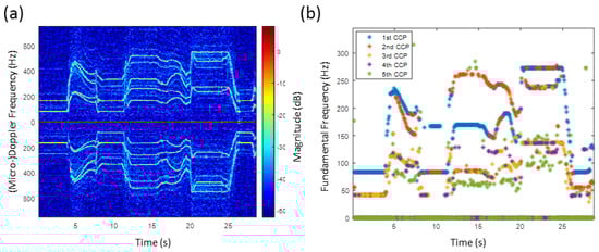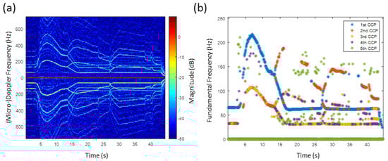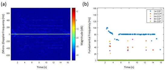 In Figure 6a, the HERM lines spectrogram of a one propeller drone is shown. At about 2 s, the propeller rotation frequency was increased and decreased again to a certain level and manoeuvered to different directions. At 14.5 s, the drone was switched off. Because of the small dimensions of the drone and the radar specifications, the HERM lines appear very weak, and the SNR is very low.