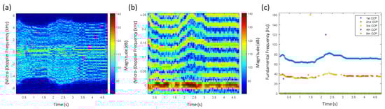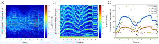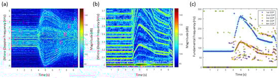 Because a HERM lines spectrogram usually contains chopping and spool lines, typically the CCP with higher magnitude is related to the chopping frequency and the CCP with lower magnitude to the spool frequency. For example for a one propeller drone, the 1st CCP properly represents the chopping frequency and the 2nd CCP the spool frequency. This is due to the fact that the magnitude of the spool lines is normally smaller than the magnitude of the chopping lines (see Figure 4d), and this leads to a smaller CCP magnitude.