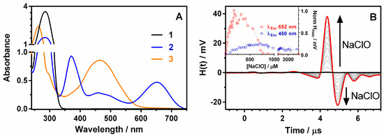 (A): Absorption spectra of TMB, 2 and 3, in PBS. (B): TMB photoacoustic waveforms enhancement upon successive NaClO additions in PBS ([TMB] = 200 μM; [NaClO] = 0–150 μM;λexc = 652 nm). Inset: Photoacoustic maximum amplitude in function of the amount of NaClO added. The excitation wavelengths were 652 (2; red line) and 450 (3; blue line) nm. [TMB] = 200 μM.