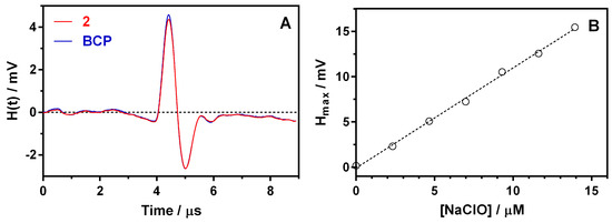 Determination of ϕ for 2 (red line) in PBS (pH 7.4). The reference photoacoustic wave was obtained using an optically matched bromocresol purple solution (BCP; ϕ = 1 (0.1 M NaOH); blue line) [46] at the excitation wavelength (λExc = 652 nm). (B): Photoacoustic maximum amplitude vs. concentration of NaClO added in PBS (pH 7.4). [TMB] = 200 μM; λexc = 652 nm.