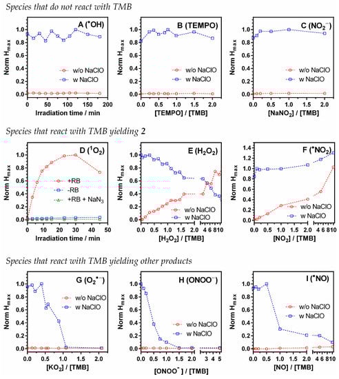 Photoacoustic maximum amplitude of TMB after reacting with different ROS and RNS. (A): Hydroxyl radical (•OH), generated via sodium nitrite photolysis in water (λexc = 354 ± 20 nm). (B): (2,2,6,6-Tetramethylpiperidin-1-yl)oxyl (TEMPO). (C): Sodium nitrite (NaNO2). (D): Singlet oxygen (1O2), generated via Rose Bengal irradiation (λexc = 520 ± 18 nm). (E): Hydrogen peroxide (H2O2). (F): Nitrogen dioxide (•NO2), generated via sodium nitrite acid decomposition. (G): Superoxide radical anion (O2•−). (H): Peroxynitrite (ONOO−). (I): Nitric oxide (•NO), generated via sodium nitroprusside decomposition. As a control for B, C, E, F, G, H after the acquisition of the photoacoustic signal, 100 μM NaClO was added and their photoacoustic signal was measured again (red and blue line, respectively).