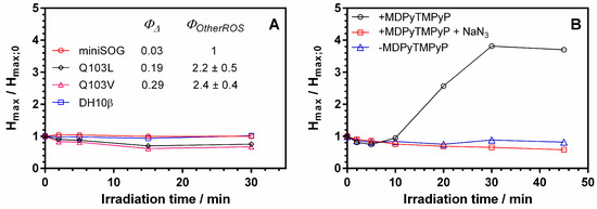 Photoacoustic maximum amplitude enhancement of TMB for (A) untransformed DH10β (blue squares) and miniSOG-expressing (red circles, black rhombuses, and magenta triangles for miniSOG, miniSOG Q103L and miniSOG Q103V, respectively) E. coli cells for different irradiation times (lamp power 14.0 mW/cm2; λIrr = 459 ± 10 nm). The values of 1O2 quantum yield (ΦΔ) and relative generation of other ROS (ΦOtherROS) by miniSOG and its mutants Q103L and Q103V are taken from [68]. (B): E. coli ATCC 25922 cells in the presence (200 μM; black circles) and absence (blue triangles) of MDPyTMPyP for different irradiation times (lamp power 5.5 mW/cm2; λIrr = 420 ± 20 nm). The control experiment was realized coincubating MDPyTMPyP with 50 mM NaN3 (red squares).
