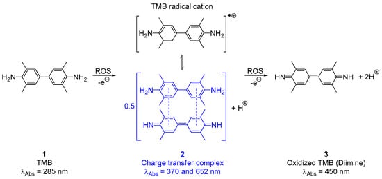 As shown in Scheme 1, TMB reacts with an oxidant agent to yield a radical cation (TMB•+), which forms a blue (λabs = 652 nm) charge transfer complex (2) with a second TMB molecule. In some cases, the presence of an additional oxidizing agent leads to a diimine product (3), which has a yellow coloration (λabs = 450 nm) [41,43,45]. Finally, with a large excess of an oxidizing agent, the reaction will proceed to yield other non-colored oxidized derivatives. In this work, we have assessed the potential of TMB as an acoustogenic photoacoustic probe for ROS/RNS using laser-induced optoacoustic spectroscopy (LIOAS). We have studied its reactivity towards different ROS/RNS in water and have used it to detect 1O2 generated in E. coli cells.