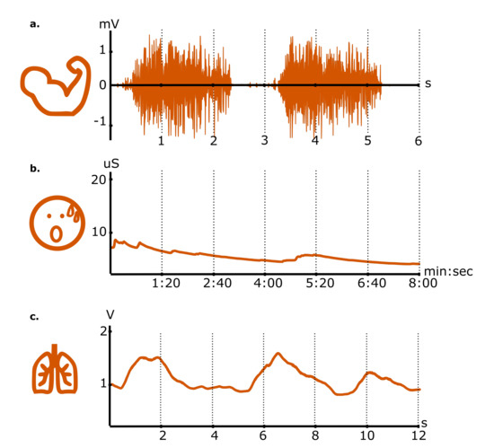 Visual representation of different biosignals: (a) Electromyography (EMG), (b) Electrodermal activity (EDA) and (c) Respiration signals. biosignals and icons obtained at PLUX S.A.