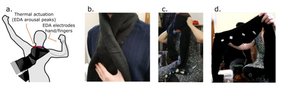 In the design space of affective interaction and physiological data, existing research has utilized visual and haptic technologies for affective feedback. Affective Health [40], for example, mapped skin conductance data measured from an electrodermal activity sensor (EDA) into a colorful spiral on a mobile phone screen. After using the mobile app for a month, users interpreted the skin conductance data as a tool to manage stress levels, track emotions, monitor personality, and even to change their behaviors. Khut [41] has been a pioneer in the area of designing heart rate based visual and sonic artworks for relaxation, both through a mobile app and large scale projections. HCI researchers have started to utilize alternative materials such as thermochromic ones to visually represent biosensing data. Howell et al. designed Ripple [42], a thermochromic-based shirt that changes colors responding to skin conductance. By using the garment over a two-day period, wearers were able to reflect on their emotions but they rarely questioned if the display was actually representing their feelings. In Reference [43], Umair et al. mapped skin conductance to haptic changes in addition to using visual thermochromic materials, that is, vibrations, heating, and squeezing effects. The feedback about the body properties measured is worn, felt or placed in contact with the body. The findings of these studies highlight that the material-driven qualities of such visual and haptic body interactions shape people’s interpretation of how they identify, attribute, and regulate emotions in everyday life. Haptics have also been used with biosensors to regulate affect, which requires users to adapt their ongoing feelings. EmotionCheck [44] and Doppel [45] use vibrations simulating a slower heart rate sensation for the users and helped them decrease their anxiety. Recently, Miri et al. [46] used a vibration-based personalized slow-paced breathing pacer on the belly which delivered vibrations in a biphasic pattern for inhalation and exhalation and helped users in reducing anxiety during a stressor. With a research approach that explicitly sets out to design with the body—not as an object to be measured but “understanding the body as a site of creative thinking and imagination” [47]—, works at the intersection of biosensing, interaction design and affective technologies offer an opportunity to study how to support the design of interactions that make us connect with our bodies [9,48,49].