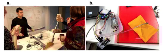 The rise of tracking technologies has started to foster international collaborations that tackle the design of technologies for emotional awareness and regulation to support wellbeing and affective health. In fact, mental health research is trying to catch up with the affordances that ubiquitous technologies, wearable devices, and tracking systems offer in general, albeit not without challenges [1,2,3]. These can be addressed through interdisciplinary research bridging the gap between the fields of Human-Computer Interaction (HCI), Biosensing research, and Clinical psychology [4,5,6]. Projects such as AffecTech [6,7], have explored the development of digital platforms that position bodily affective awareness and engagements centrally, drawing on somaesthetic design [8]. Somaesthetic, or soma design for short, is grounded in somatic experiences, letting designers examine and improve on connections between sensation, feeling, emotion, subjective understanding and values. The soma design framework offers a coherent theoretical basis starting from the constitution and morphology of our human body and perception [8,9,10]. In particular, soma design emphasizes our ability to change and improve our aesthetic appreciation skills and perception. Other interaction design works within affecting computing exemplify ways to draw upon the body and its embodied metaphors [11,12]. This research builds on the growing HCI interest in affective technologies, whose ethical underpinnings could benefit from more consideration [13,14], addressing issues such as the pluralism of bodies, data privacy and ownership. The body has for a long time inspired emotion research across disciplines [15,16,17,18], as relevant connections exist between the body, emotion and movement, its interpretation, enacting and processing. Moreover, research studies point at the links between emotion and physical activity, for example, dance, exercise, movement, or paying attention to our body senses while immersed in nature [19,20,21]. Engagement with and through the body might therefore be a fruitful path to explore. There is room for an affective computing that does not look at the body as “an instrument or object for the mind, passively receiving sign and signals, but not actively being part of producing them”—as phrased by Höök when referring to dominant paradigms in commercial sports applications [22]. However, how to best address bodily movement and engagement beyond measuring cues and signals is unclear. Most studies in affective computing revolve around affect recognition from emotion detection and bodily data classification [23]. We take somaesthetic design—a design stance that draws upon the felt body and takes inspiration from experiencing it—and then combine it with the innovative integration of biosensors and actuators. The disruptive somaesthetic view, moves away from the idea of monitoring the body for the sake of bad habit reduction in pursuit of a healthy and long life [24]. Soma design, rather, lets us get attuned to our bodies and use sensations as a valuable resource instead of something to be improved to meet performance standards.