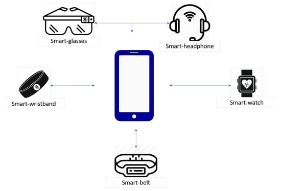In our definition of a wearable environment, the interconnection among all these devices is mediated by a smartphone, which plays two roles, being both a data-generating device and a data collection hub for other wearables. For a large-scale application, the wearable environment would include several smartphones, each acting as the hub for a group of wearables: in the following, we describe the simplest case of a single smartphone, although the extension to a larger environment is possible.