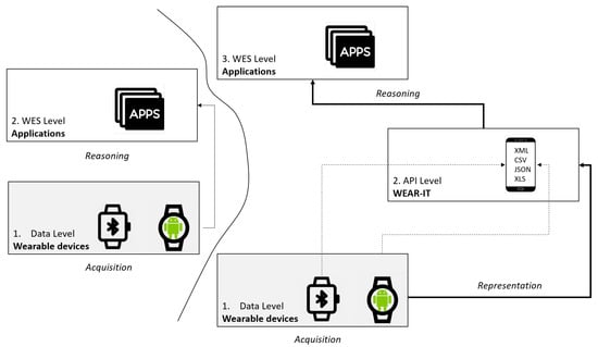 Figure 2 depicts this change of perspective. The traditional two-tier architecture of a wearable expert system, based on acquisition of data from sensors on a wearable device and reasoning exploiting them, is extended to a three-tier architecture by adding an explicit data representation level. The main benefit is the possibility to make the reasoning process independent of the specific representation of necessary data: while in the first case (on the left in Figure 2) the WES must implement an opportune strategy for representing information gathered by sensors, in the second one it must only notify the representation level about the characteristics of needed data and their format, being notified when data are available accordingly.