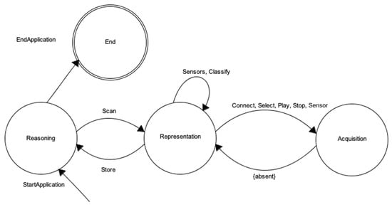 When an application, i.e., a WES, is activated on the smartphone, the wearable environment enters the reasoning level. This is the initial state of the FSM: in fact, the information flow within a wearable environment is always started according to the needs of one or more applications. It is important to notice that the reasoning level is the final state too: the application could decide to execute its own decision making process and terminate without interacting with other levels, depending on its strategy. Otherwise, it will move to the representation level to obtain necessary data to complete the body. This state is activated by a scan input, which specifies the application needs to know which wearable devices and sensors are available nearby to gather data. From now on, the wearable environment can maintain the representation level, move to acquisition level or come back to reasoning level. The sensors and classify inputs cause the level maintenance, being actions that provide lists of sensors around and their clustering according to the nature of detected data; the connect, select, play and stop inputs cause the transition to the acquisition state, being actions that allow establishing a connection with a specific wearable device, selecting one sensor on it and starting/stopping detection of data through it. Finally, coming back to the reasoning state is performed when the store input is given, since all the data necessary to the reasoning level to accomplish its actions are available.
