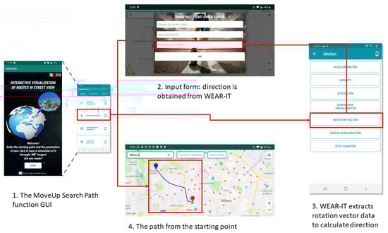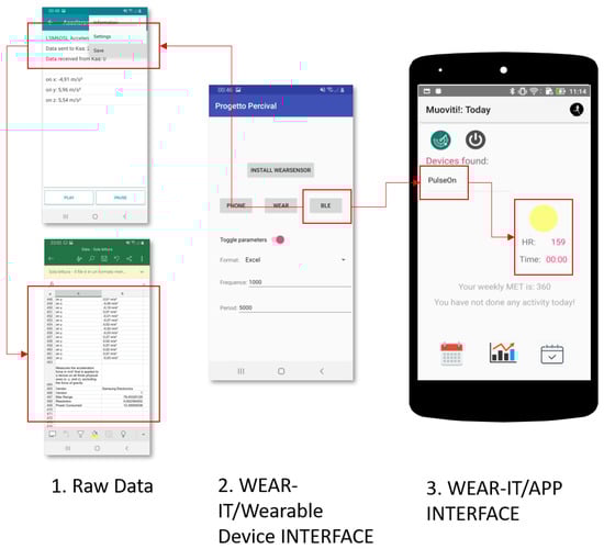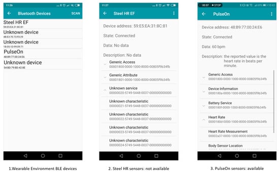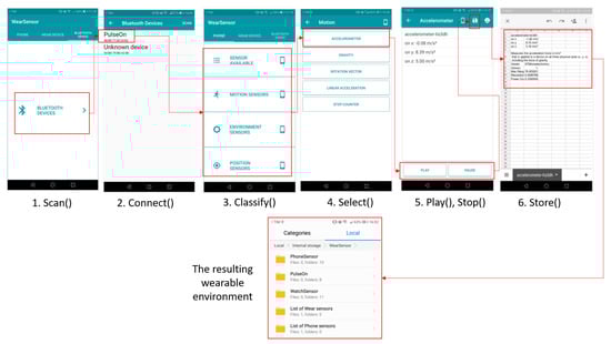 To our knowledge, only three applications provide services comparable to WEAR-IT: SensorCap, Sensor Toolbox and LightBlue Explorer (see https://play.google.com/store/apps/details?id=br.ufmg.dcc.ssig.sensorcap; https://play.google.com/store/apps/details?id=com.galaxy.sensortoolbox; and https://play.google.com/store/apps/details?id=com.punchthrough.lightblueexplorer). With respect to them, only WEAR-IT can be integrated (see Figure 8) into a wearable environment at the moment, while the others can be used as external services to collect and store data that can be then elaborated by the application.
