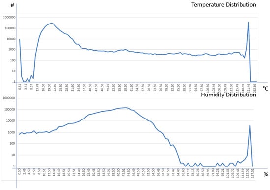 Figure 11 shows the distribution of values for the temperature and humidity variables. It is possible to notice how the temperature curve is uniformly distributed between 10 and 35 C; these values are much more than others, constituting the set of correct values for the temperature detection. Moreover, there are some peaks of anomaly values that are very frequent. i.e., 0.51 and 121.49 C. About humidity, the distribution is Gaussian between 24% and 60% and uniform between 0% and 24%; moreover, there are very few measurements in the (60%, 100%] range, with a significant peak of anomaly at 114.45% (about 4000 units).