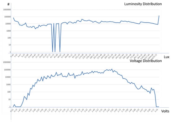 Figure 12 presents the distribution of values for the luminosity and voltage parameters. The luminosity distribution is linear on the whole interval, except for peaks at the limits (0 and 1600 lux respectively) and some anomalies at 41, 43 and 48 lux values. Finally, the battery voltage distribution is Gaussian, without any significant peak or anomaly.