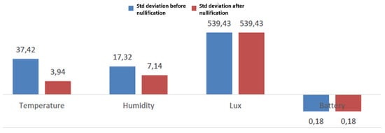 Standard deviation of temperature, humidity, luminosity and voltage values before and after nullification.