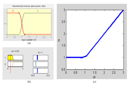 The membership function curves/rule viewer/input–output surface viewer. (a) The membership function; (b) the rule viewer; (c) the input–output surface viewer.