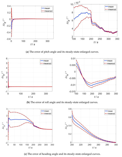 The velocity measurement noise of SINS on stationary base is assumed to be Gaussian white noise with amplitude of ; the filtering period is ; the correction mode is selected as feedback correction. The alignment accuracy is evaluated by using the difference between the fine alignment results and the true attitudes.