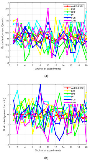 In Experiment 1 and Experiment 2, the 20 groups of misalignment angle errors of nonlinear alignment methods based on AFIS-EKF2, EKF, UKF, PF, FOS, and ANN at alignment completion time are counted, and the statistical curves of misalignment angle errors of each filtering algorithm in Experiment 1 are drawn, as shown in Figure 9. In Experiment 2, only the AFIS–EKF2 algorithm proposed in this paper can achieve alignment successfully, and the other five methods are all failed to align, so the statistical data graphs of Experiment 2 are no longer drawn. The Root Mean Square Error (RMSE) of misalignment angle errors of each algorithm in Experiment 1 and Experiment 2 are calculated, as shown in Table 6.