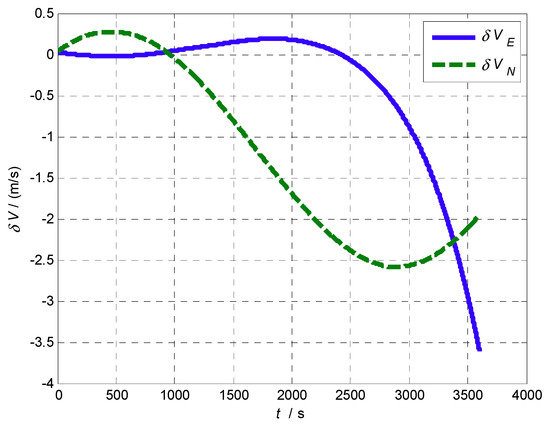 The experimental steps are as follows: Firstly, the proposed AFIS-EKF2 alignment method is performed for SINS initial alignment with large misalignment angles under the condition of vehicle idling; after initial alignment, INS switches to the inertial mode, the SINS navigation is carried out for a one hour duration; finally, the levels of SINS errors are analyzed by compared with reference velocity and position from SINS/GPS integrated navigation system. The velocity errors of SINS are shown in Figure 11 and position errors of SINS are shown in Figure 12.