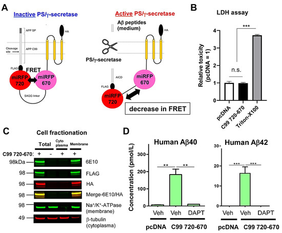 To better understand the functional relationship between PS/γ-secretase activity and other cellular signaling pathway(s) in real-time, a new red-shifted biosensor reporting PS/γ-secretase activity that is spectrally compatible with the biosensors for monitoring other essential cellular events needs to be developed. This study reports developing and validating a novel PS/γ-secretase activity biosensor C99 720-670 probe utilizing NIR fluorescent proteins: miRFP670 [33] and miRFP720 [34] (Figure 1A). For the development of the C99 720-670 biosensor, Turquoise-GL and YPet in our recently reported C99 Y-T biosensor [21] were replaced with miRFP670 and miRFP720, respectively. First, to examine if the C99 720-670 biosensor is nontoxic in cells, we expressed the C99 720-670 biosensor or empty vector in CHO cells, followed by performing the LDH cytotoxicity assay. We used CHO cells in our present study because the line is well known to express endogenous functional PS/γ-secretase [36,37] and is widely used to examine its role. We found that LDH level in the conditioned medium of the C99 720-670 biosensor expressing CHO cells was similar to that in the cells expressing empty vector, indicating that the C99 720-670 biosensor does not cause toxicity in cells (Figure 1B). A cell fractionation assay verified that the C99 720-670 biosensor is integrated into the membrane (Figure 1C). To determine if the C99 720-670 biosensor is cleaved by endogenous PS/γ-secretase, we expressed the C99 720-670 biosensor or empty vector in CHO cells, and the cells were treated with γ-secretase inhibitor (GSI), DAPT or vehicle control for 16 h. The conditioned medium was then collected to measure “human” Aβ40 and Aβ42 by ELISA, which are the products of C99 720-670 biosensor cleavage by PS/γ-secretase. Expression of the C99 720-670 biosensor allowed clear detection of human Aβ40 and Aβ42 in the conditioned medium at approximately 10:1 ratio of Aβ40 to Aβ42, which was blocked by DAPT treatment (Figure 1D). These results indicate that endogenous PS/γ-secretase processes the C99 720-670 biosensor in CHO cells.