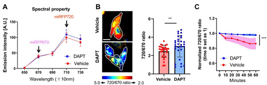Processing of the C99 720-670 biosensor by PS/γ-secretase decreases the FRET between miRFP670 and miRFP720. (A) Spectral property of the CHO cells expressing the C99 720-670 biosensor. The cells were excited by a 640 nm laser, and fluorescence emission intensity within 650–730 ± 10 nm was measured. One micromolar DAPT decreased the 670 ± 10 nm but increased the 710 ± 10 nm emission. n = 30 cells. (B) The pseudo-colored images of the 710 ± 10 over 670 ± 10 nm emission ratio (720/670 ratio) in the CHO cells corresponding to Figure 2A. Scale bar, 50 um. The 720/670 ratio was significantly increased in the cells treated with 1 µM DAPT compared to vehicle control. n = 30 cells; mean ± SD; ** p < 0.01, Mann–Whitney U test. (C) Longitudinal monitoring of the 720/670 ratio in the C99 720-670 biosensor expressing cells. ROIs were created around the entire cell. Then, the 720/670 ratio was measured every 10 min for 1 h by time-lapse spectral FRET analysis. The ratio at time point 0 was set as 1, and the relative 720/670 ratio was calculated on a cell-by-cell basis. A time-dependent decrease in the 720/670 ratio in vehicle-treated cells was cancelled by the treatment with 1 µM DAPT (n = 20 cells). mean ± SD; *** p < 0.001, Repeated Measures ANOVA.